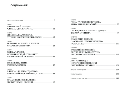 Uzmanības centrā ir Marks Aldanova, Vladimirs Veidle, Gaito Gazdanovs, Aleksandrs Kuprins, Mihails Osorgins, Fjodors Stepuns un citi, kuru dzīves un darbi ir savijušies vēsturē un šīs grāmatas lappusēs. Autore uzskata savu uzdevumu atgriezt lasītājam šo neatņemamo nacionālās kultūras sastāvdaļu.