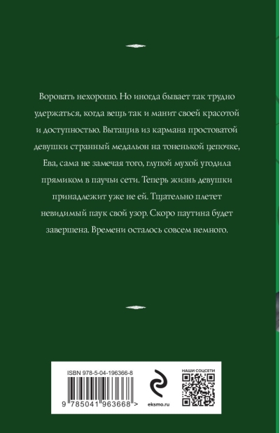 Zagt ir slikti. Bet dažreiz ir tik grūti pretoties, kad lieta vilina ar savu skaistumu un pieejamību. Izvilkusi no vienkāršās meitenes kabatas dīvainu medaljonu uz tievas ķēdes, Eva, to nemanot, iekrita kā stulba muša taisni zirnekļa tīklā. Tagad meitenes dzīvība viņai vairs nepieder. Neredzamais zirneklis rūpīgi auž savu rakstu.