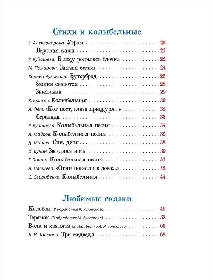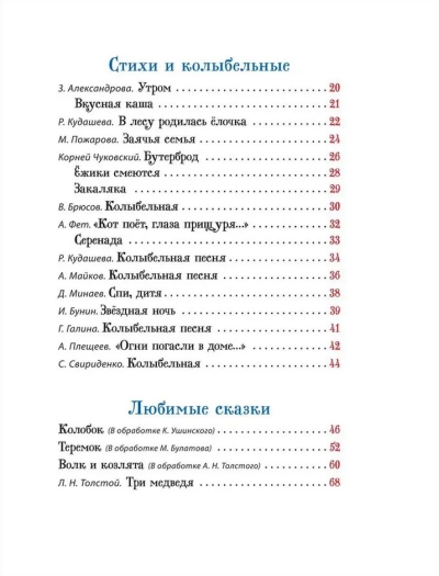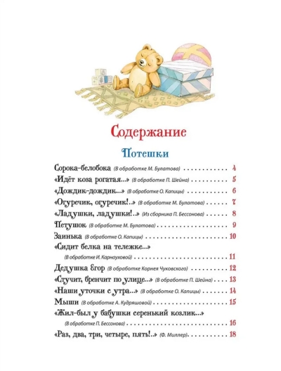 Šajā krājumā iekļautas krievu tautas pasakas, dzīvespriecīgas bērnu dziesmiņas, aizkustinošas šūpuļdziesmas un pļāpīgi dzejoļi mazajiem. Košās lappusēs ir lielas ilustrācijas, liels fonts ērtai lasīšanai kopā ar bērniem un profesionālu rakstnieku rediģēti teksti.