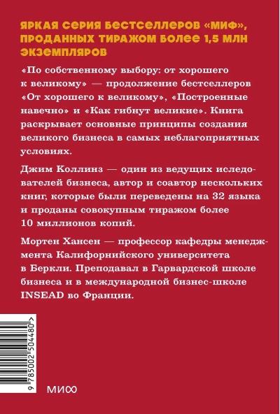 Jauns izdevums grāmatai "Lieliski pēc izvēles". Turpinājums bestselleriem "No laba līdz izcilam", "Veidots, lai izturētu" un "Kā varenie krīt". Šī grāmata atklāj izcilu uzņēmumu veidošanas pamatprincipus visnelabvēlīgākajos apstākļos.