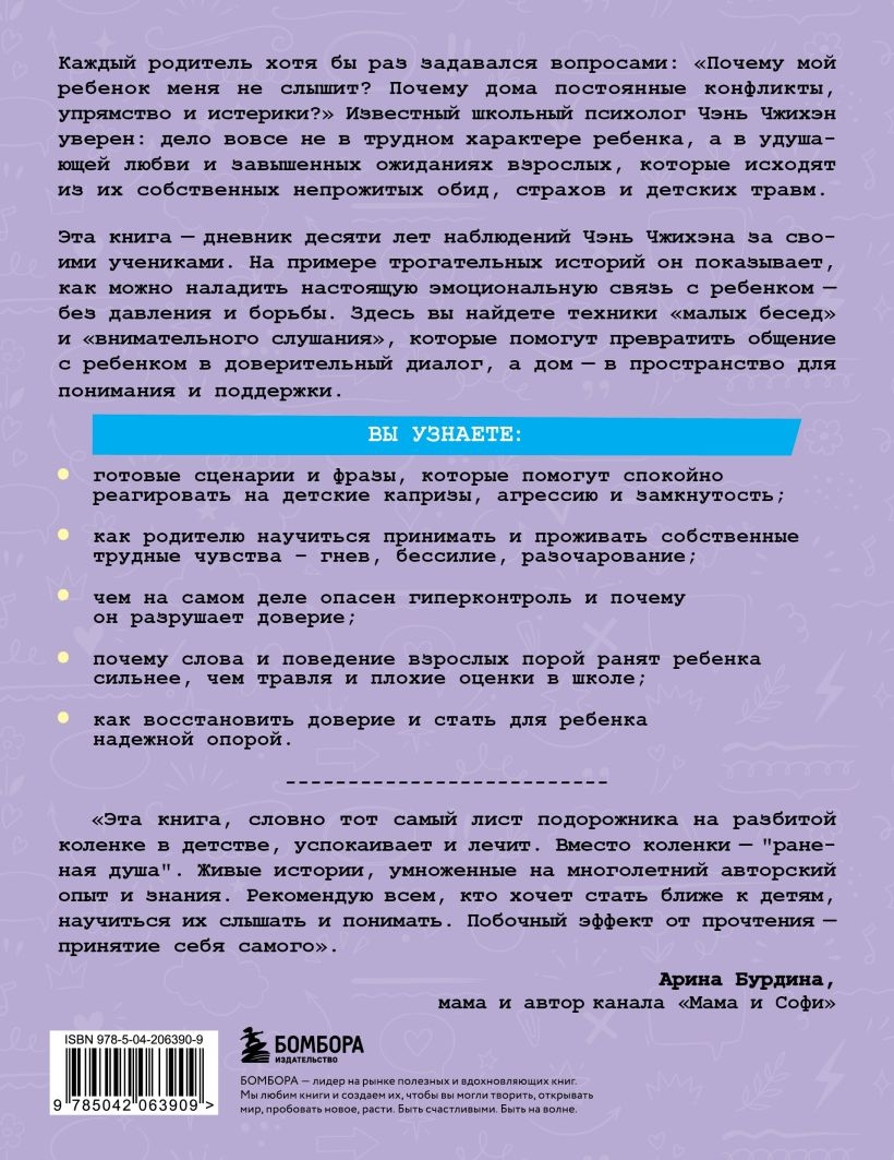 Šī grāmata ir Čena Džihena desmit gadu ilga savu skolēnu novērošanas dienasgrāmata. Izmantojot aizkustinošos stāstus, viņš parāda, kā izveidot patiesu emocionālu saikni ar bērnu — bez spiediena vai cīņas. Šeit jūs atradīsiet "small talk" un "uzmanīgas klausīšanās" metodes, kas palīdzēs pārveidot jūsu mijiedarbību ar bērnu uzticības pilnā dialogā un jūsu mājas par sapratnes un atbalsta telpu.