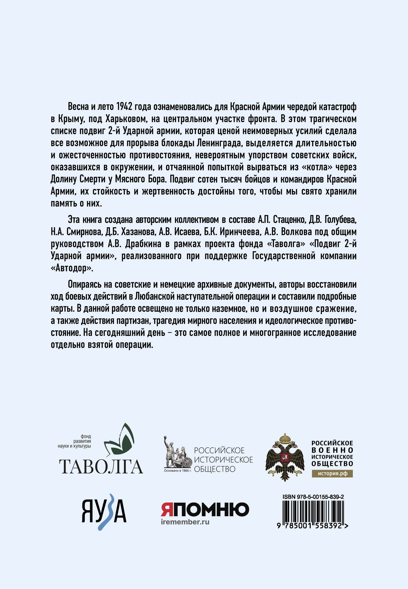 1942. gada pavasaris un vasara Sarkanajai armijai iezīmējās ar virkni katastrofu Krimā, netālu no Harkovas un frontes centrālajā sektorā. Šajā traģiskajā sarakstā 2. triecienarmijas varonība, kas par neticamiem centieniem darīja visu iespējamo, lai pārrautu Ļeņingradas blokādi, izceļas ar konfrontācijas ilgumu un mežonīgumu, ielenkto padomju karaspēka neticamo neatlaidību un izmisīgo mēģinājumu izlauzties no "katla" caur Nāves ieleju pie Mjasnojboras. Simtiem tūkstošu Sarkanās armijas karavīru un komandieru varonība, viņu izturība un upuri ir pelnījuši mūsu svēto piemiņu.