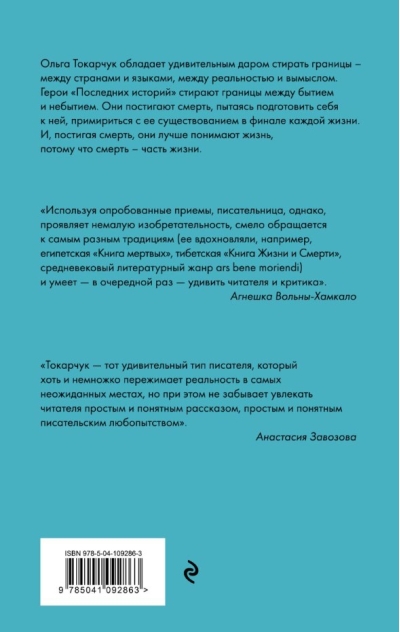 Olgai Tokarčukai piemīt apbrīnojama spēja nojaukt robežas — starp valstīm un valodām, starp realitāti un fikciju. "Pēdējo stāstu" varoņi nojauk robežas starp eksistenci un neesamību. Viņi izprot nāvi, cenšoties tai sagatavoties, samierināties ar tās eksistenci katras dzīves beigās. Un, izprotot nāvi, viņi labāk izprot dzīvi, jo nāve ir daļa no dzīves.