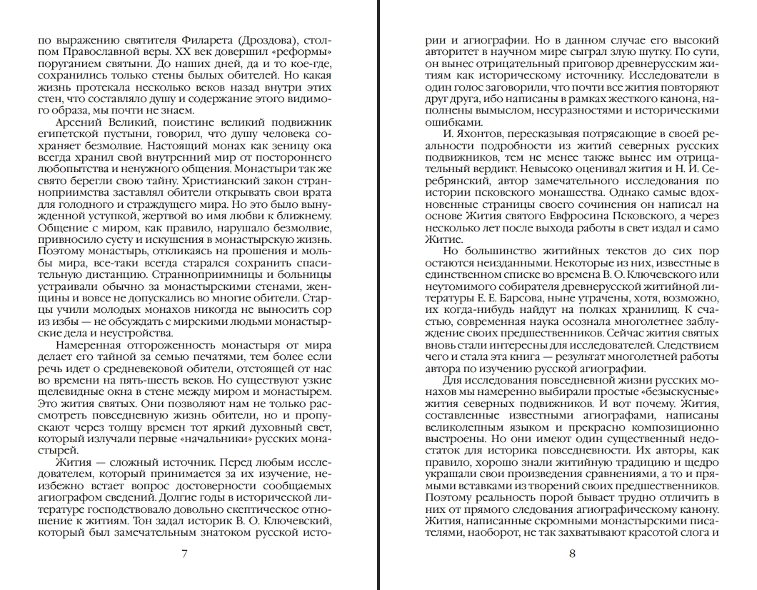 Vai ir iespējams pacelt noslēpuma plīvuru, kas apvij viduslaiku krievu klosteru dzīvi? Šķiet, ka šī brīnumainā pasaule, kurā īsti, prātu satriecoši brīnumi kļuva par ikdienas sastāvdaļu, jau sen ir izgaisusi aizmirstībā, kļūstot par pagātni. Taču ir saglabājušās seno svēto dzīves kopijas, kādreiz iznīcināto, bet tagad atjaunoto klosteru sienas un torņi, un ir saglabājušies autentiski priekšmeti, kas piederējuši svētajiem tēviem un daudzu krievu klosteru iemītniekiem. Šī grāmata ir pirmais mēģinājums krievu vēsturiskajā literatūrā atjaunot autentisku viduslaiku krievu klostera pasauli visā tās bagātībā un daudzveidībā.