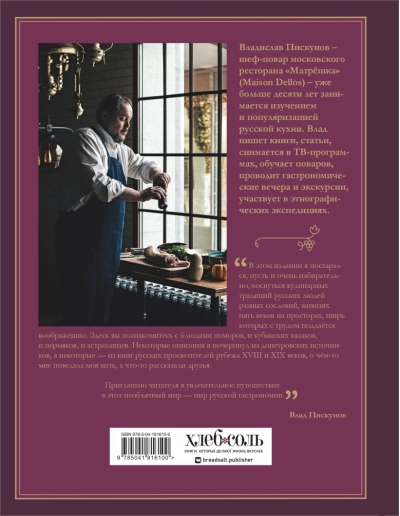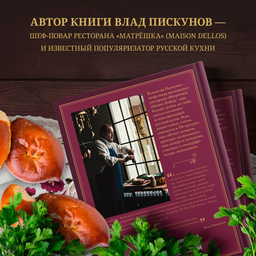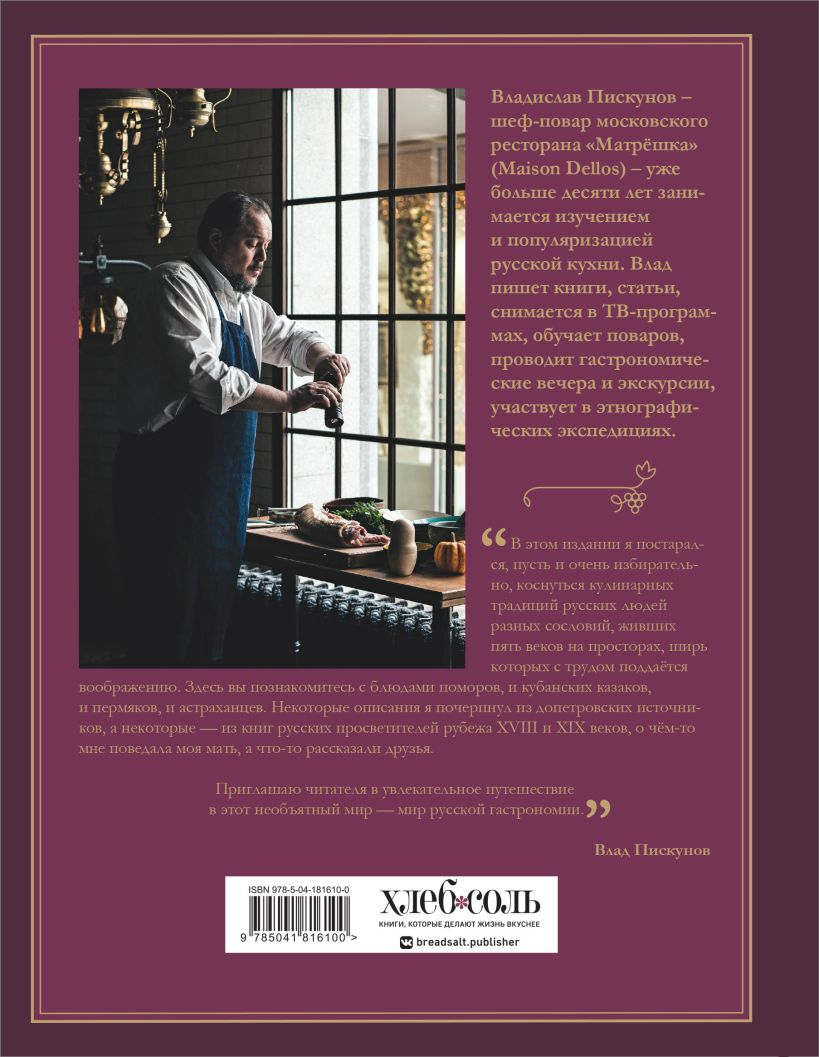"Krievu virtuve. “Galvenais 500 gadiem” ir restorāna Matrjoška šefpavāra, krievu virtuves popularizētāja un daudzu pavārgrāmatu un rakstu autora Vladislava Piskunova trīssējumu grāmatas pārstrādāta versija. Autors ir izvēlējies jums labāko un atstājis galveno. Vlads vairāk nekā 10 gadus studē krievu virtuvi: vāc receptes no krievu autoru grāmatām, ceļo pa Krieviju, komunicē ar kulinārijas tradīciju glabātājiem un meklē nepazīstamu krievu ēdienu nosaukumus V. Dāla Dzīvās lielkrievu valodas skaidrojošajā vārdnīcā. Pats "Krievu virtuves" autors gatavoja, fotografēja un ēda ēdienus, kurus tagad vari atkārtot!