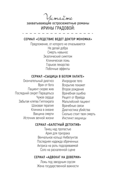 Pieņemšanas laikā savā savrupmājā mirst slavenā aktrise Larisa Bujakina. Visi apkārtējie ir pārliecināti, ka tā ir slepkavība. Galu galā maz ticams, ka Larisa, kas tikko brīnumainā kārtā kļuvusi slaidāka un saņēmusi ilgi gaidīto lomu jaunā filmā, būtu nokārtojusi rēķinu ar savu dzīvi, izlecot no pirmā stāva balkona. Bet kas varētu nogalināt nekaitīgo Larisu un kāpēc visi izmeklēšanas pavedieni ved uz negadījumu, kurā viņa iekļuva pirms pusgada?