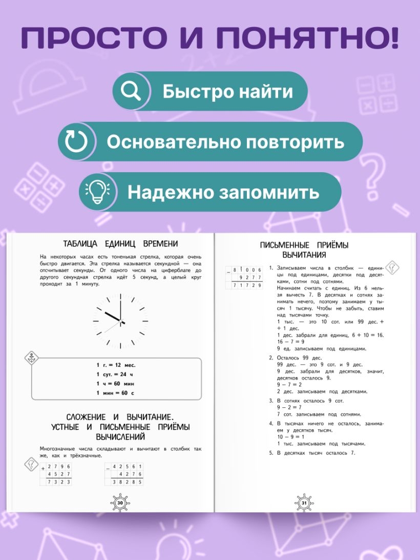 Šī rokasgrāmata ir paredzēta sākumskolas skolēniem, kuri mācās paātrinātā trīs gadu programmā vai individualizētā plānā, kā arī skolotājiem, kas strādā ar programmu "Efektīva sākumskola". Galvenā prasība attiecībā uz rokasgrāmatām sākumskolas skolēniem ir kodolīgs un skaidrs mācību materiāla izklāsts. Šajā rokasgrāmatā viss trešās klases matemātikas kurss saskaņā ar trīs gadu programmu ir sniegts ļoti pieejamā formātā, izmantojot tabulas, diagrammas, noteikumus un pielietošanas piemērus. Šāda izklāsta veidā skolēni var ātri atrast nepieciešamo mācību informāciju, rūpīgi to pārskatīt un droši atcerēties. Šī modernā un viegli lietojamā rokasgrāmata ir izstrādāta, pilnībā ievērojot Federālā valsts izglītības standarta prasības pamatizglītībai.