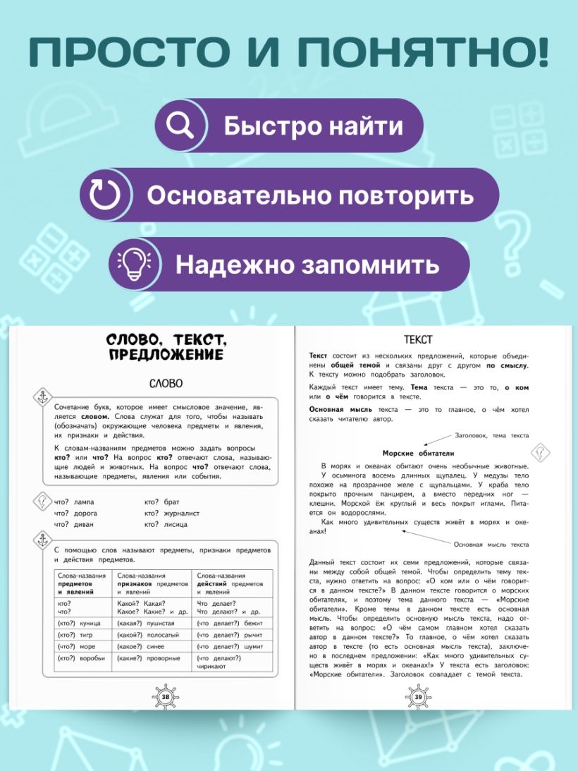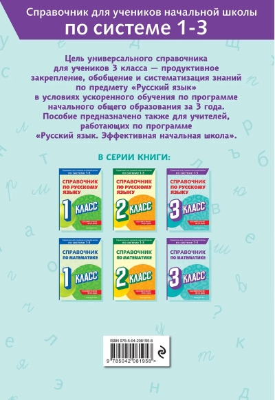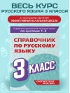 Šī rokasgrāmata ir paredzēta sākumskolas skolēniem, kuri mācās paātrinātā trīs gadu programmā vai individualizētā plānā, kā arī skolotājiem, kas strādā ar programmu "Efektīva sākumskola". Galvenā prasība attiecībā uz pamatskolas skolēnu rokasgrāmatām ir kodolīgs un skaidrs mācību materiāla izklāsts. Šajā rokasgrāmatā ir sniegts viss krievu valodas kurss trešajai klasei, pamatojoties uz trīs gadu mācību programmu, ļoti pieejamā formātā, izmantojot tabulas, diagrammas, noteikumus un pielietošanas piemērus. Šāda izklāsta veidā skolēni var ātri atrast nepieciešamo mācību informāciju, rūpīgi to pārskatīt un droši iegaumēt. Šī modernā un viegli lietojamā rokasgrāmata ir izstrādāta, pilnībā ievērojot Federālā valsts izglītības standarta prasības pamatizglītībai.