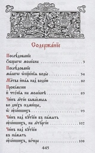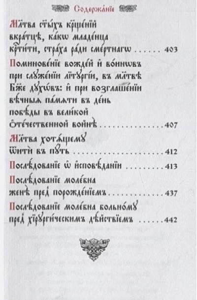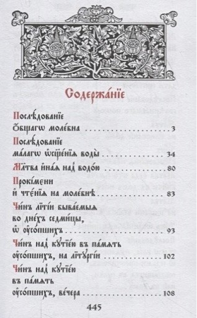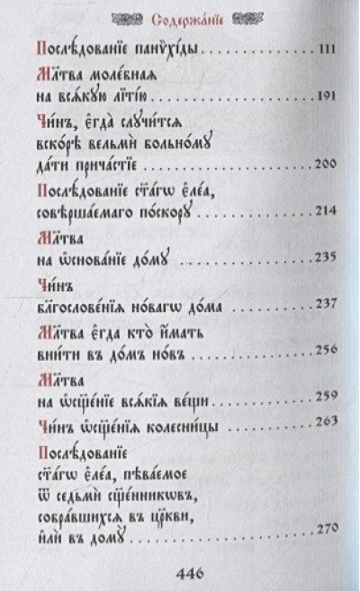 Publikācijā iekļauti šādi dievkalpojumi: vispārēja lūgšana, neliela ūdens svētīšana, svētīta eļļa, grēksūdze, lūgšanas sievai pirms dzemdībām un pacientam pirms operācijas, rituāli mirušajam, rituāli un lūgšanas par citām svētībām un svētībām.