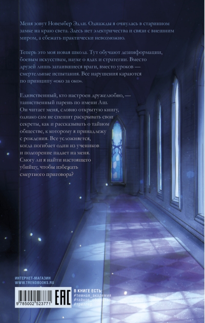 Kādu dienu Novembra Adlija pamodās senā pilī pasaules malā. Vai šī ir viņas jaunā skola? Bez elektrības, saziņas ar ārpasauli un jebkādiem glābšanās līdzekļiem. Noslēpumainajā akadēmijā tiek mācīta dezinformācija, manipulācijas, cīņas mākslas un saindēšanās zinātne. Draugu vietā ir tikai slēpti ienaidnieki, un mācību vietā ir nāvējoši pārbaudījumi. Vienīgais cilvēks, kurš šķiet draudzīgs, ir noslēpumains zēns vārdā Ešs. Viņš lasa novembri kā atvērtu grāmatu, bet nevēlas atklāt savus noslēpumus. Viss kļūst sarežģīti, kad nomirst kāds students, un aizdomas krīt uz novembri. Vai viņai izdosies atrast īsto slepkavu, lai izvairītos no nāvessoda un atklātu akadēmijas noslēpumus?