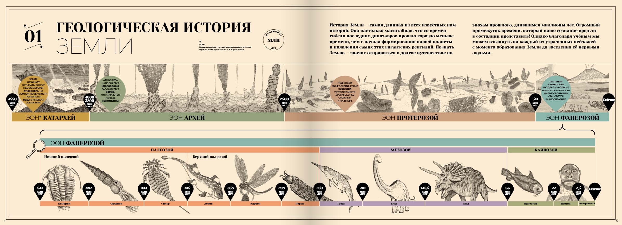 No visām mums zināmajām vēsturēm neviena nav garāka par Zemes vēsturi. Vai varat iedomāties mūsu planētu kā milzīgu sniega bumbu? Vai arī apdzīvotu ar dinozauriem un citām neparastām dzīvības formām? Un pirms daudziem miljoniem gadu, ilgi pirms jums zināmo dzīvnieku un augu parādīšanās, tieši tā viss bija uz Zemes.