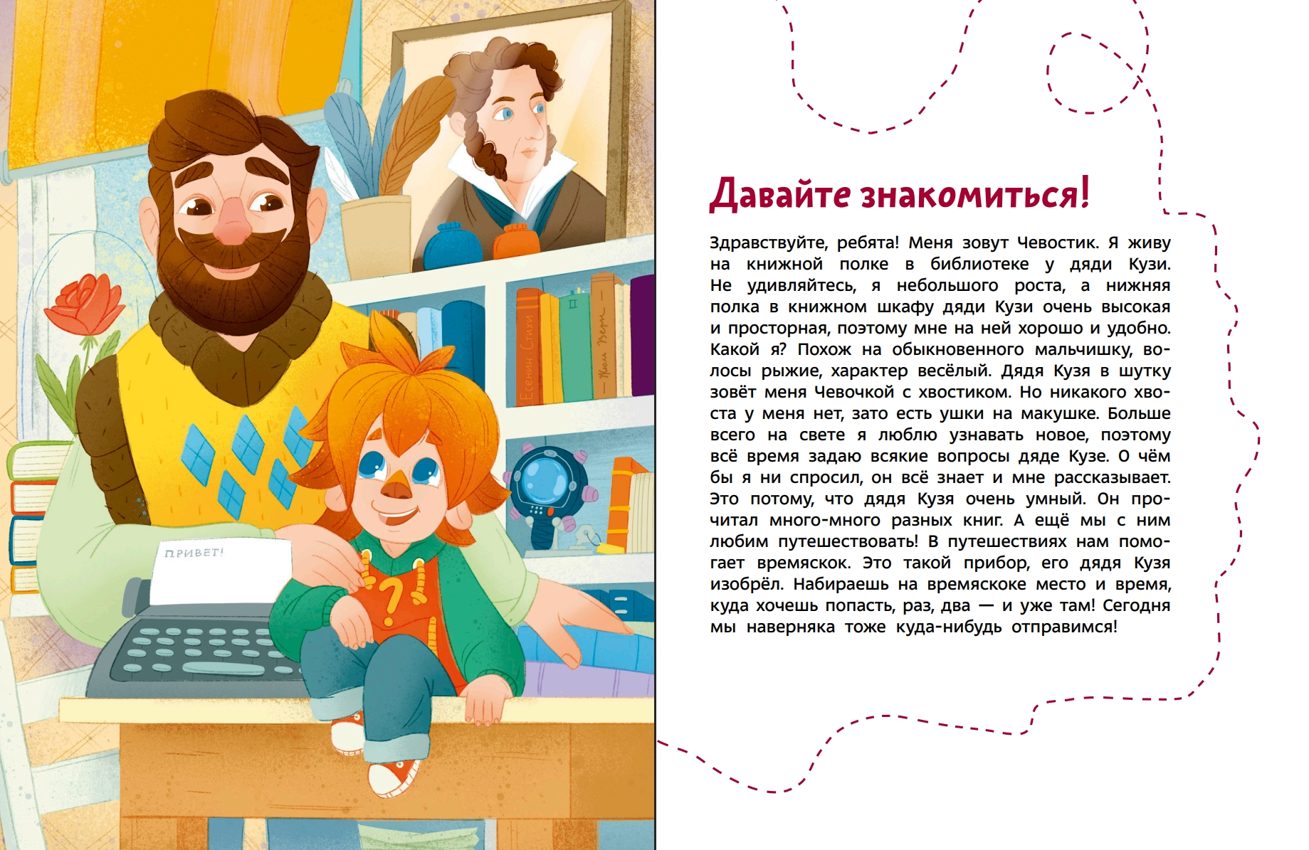 Jaunajā sērijas grāmatā Čevostiks un tēvocis Kuzja dodas aizraujošā ceļojumā pa literatūras pasauli. Viņi apmeklēs dažādus laikmetus un valstis, satiks slavenus rakstniekus un tēlus no labi zināmām grāmatām, kā arī uzzinās vairāk par bērnu literatūras žanriem un īpatnībām. Varoņi atklās, kā radās pirmās ābeces grāmatas, kādas grāmatas mīlēja caru bērni un kā ceļot laikā, izmantojot grāmatas.