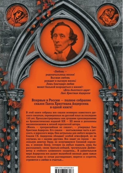 "Mīlestība ir dzīvības ciltstēvs! Augstākā mīlestība dzemdē augstāko dzīvību! Tikai caur mīlestību slimie var tikt atgriezti dzīvē!" ("Purva karaļa meita", autors Hansa Kristiana Andersena) Pirmo reizi Krievijā pieejams pilnīgs Hansa Kristiana Andersena pasaku krājums vienā grāmatā! Šajā grāmatā ir apkopoti visi pasaulslavenā dāņu rakstnieka pasakas, kas tulkotas krievu valodā pēdējo 150 gadu laikā. Tās ir ilustrētas ar labākajiem darbiem no 19. un 20. gadsimta lietotiem izdevumiem un papildinātas ar autora biogrāfiju un personīgo saraksti. "Dzīve ir visskaistākā no pasakām," teicis Hanss Kristiāns Andersens. Viņa pasakas ir neatņemama gan bērnu, gan pieaugušo pasaules sastāvdaļa. Tās ir aktuālas jebkuram vecumam. Andersena pasakām piemīt īpaša atmosfēra; tās nevar sajaukt ne ar vienu citu. Visi pazīst savus varoņus: mazo meiteni Gerdu, kura nebaidās no Sniega karalienes, un maigo Elīzu, kas gatava jebkuram varoņdarbam, lai tikai atbaidītu savus gulbju brāļus, aizkustinošo Īkstīti un nelokāmo alvas zaldātiņu... Andersena apbrīnojamajā pasaulē viss elpo maģisku dzīvību: pat visparastākās lietas naktī sarunājas, slēdz mieru un strīdas, tiecas pēc mīlestības un laimes.