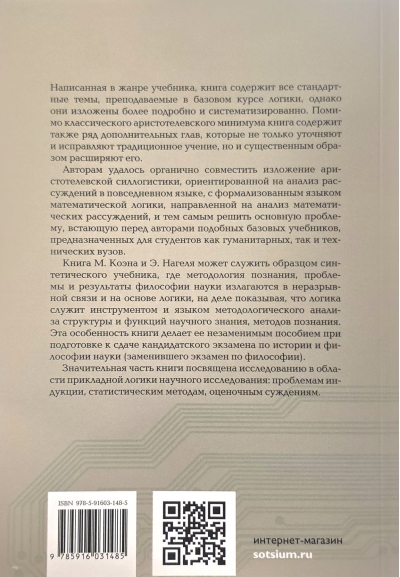 Gadu desmitiem šī grāmata kalpoja par standarta mācību grāmatu par loģiku un zinātnisko metodi lielākajā daļā Amerikas universitāšu un joprojām ir populāra (pēdējais angļu valodas izdevums tika publicēts 2007. gadā). Autori nemanāmi apvieno Aristoteļa siloģistikas teoriju ar matemātiskās loģikas formalizēto valodu un izziņas metodoloģiju izklāsta ciešā saistībā ar loģiku. Ir aptvertas visas standarta tēmas, kas tiek mācītas loģikas pamatkursā, un to izklāsts ir detalizētāks nekā standarta mācību grāmatās. Kā sintētiskam loģikas un zinātniskās metodoloģijas kursam tai nav līdzvērtīgas krievu mācību grāmatās.