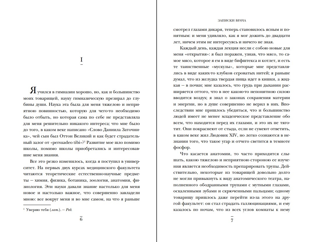 "Esmu parasts, viduvējs ārsts ar viduvēju prātu un viduvējām zināšanām; mani mulsina pretrunas, es pilnībā nespēju atrisināt daudzus sarežģītus, steidzamus jautājumus, kas man rodas ik uz soļa. Mana vienīgā priekšrocība ir tā, ka es vēl neesmu kļuvis par profesionāli, un ka man iespaidi, pie kuriem cilvēks laika gaitā neviļus pierod, joprojām ir spilgti un spēcīgi."