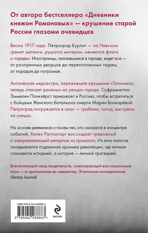 Paļaujoties uz aizmirstiem arhīviem un maz zināmām liecībām, Helēna Rapaporta savij desmitiem balsu vienā stāstījumā — satraucošā, smeldzīgā un spilgtā. Šis ir ziņojums no pagātnes, kur katrs aculiecinieks redz savu katastrofas daļu, un kopā viņi saliek kopā brūkošas impērijas panorāmu.