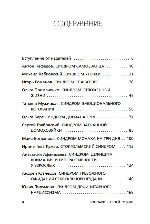 Rakstu autori ir populāri krievu psihologi: Tatjana Mužickaja, Olga Primačenko, Mihails Labkovskis, Artjoms Tolokoņins, Jūlija Pirumova, Olga Berga, Igors Romanovs un daudzi citi. Katrs no viņiem ne tikai apraksta konkrēta sindroma izpausmes, bet arī sniedz kodolīgus ieteikumus, kā mazināt tā ietekmi uz savu dzīvi. Vai pat iemācīties no tā gūt labumu.