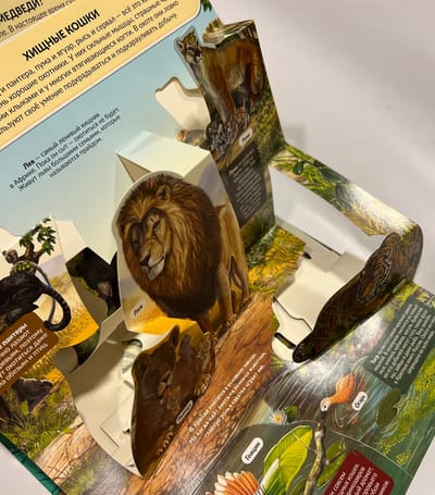 Яркая энциклопедия «Хищники» в формате книжки-панорамки с удивительными объемными иллюстрациями. 3D развороты создают ощущение дополненной реальности. Также на разворотах книги находятся откидные клапаны-сюрпризы, заглянув под которые малыш увидит интересный факт или изображение. Наличие объемных и открывающихся элементов развивает мелкую моторику и пространственное мышление ребенка. Порадуйте своего ребенка увлекательной энциклопедией-панорамкой с яркими, объемными иллюстрациями!