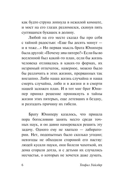 Двадцатого июля 1714 года в Перу обрушился висячий мост. Трагедия унесла жизни пятерых человек. Оказавшийся свидетелем катастрофы монах Юнипер видит в произошедшем Божий промысел. Намереваясь понять, почему Господь избрал именно этих пятерых, Юнипер пытается измерить степень благочестия погибших. Но так ли легко однозначно отнести проживших нелегкие жизни людей к заслужившим подобную кару грешникам или же к слишком рано призванным на небо невинным мученикам?