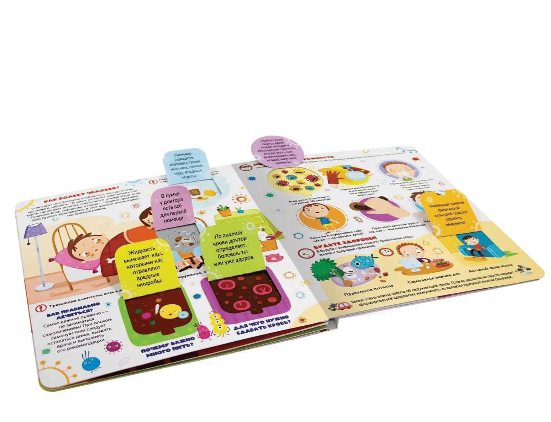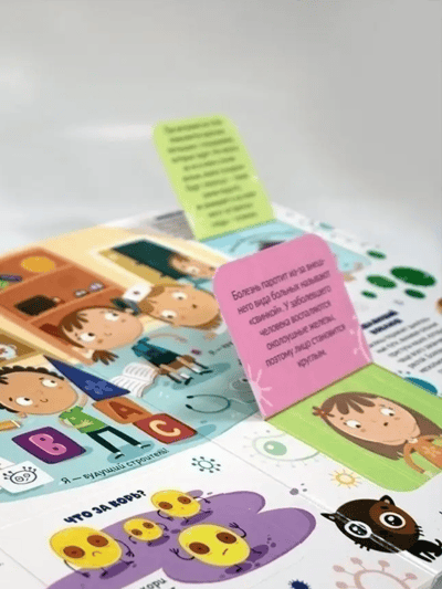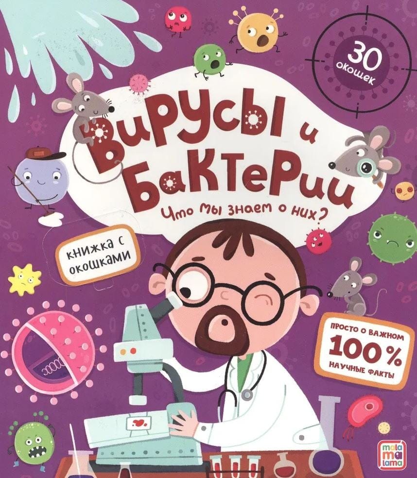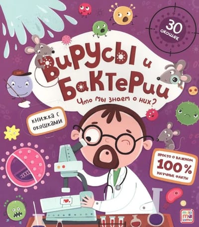 Книжка с окошками «Вирусы и бактерии. Что мы знаем о них?» расскажет ребёнку о мире микробов, окружающем нас. Внутри книги 12 красочных страниц и 30 окошек, открывая которые малыш получит массу полезной и интересной информации о том, какие бывают вирусы и бактерии, что происходит в нашем организме при попадании в него вирусов, как вырабатывается коллективный иммунитет.