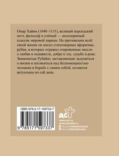 Омар Хайям (1048–1131) — великий персидский поэт, философ и учёный, неоспоримый классик мировой лирики. На протяжении всей своей жизни он писал стихотворные афоризмы, рубаи, в которых отражал сокровенные мысли о любви и ненависти, добре и зле, судьбе и роке. Знаменитые рубайат, заставляющие задуматься о жизни и посмеяться над беспомощностью человека в борьбе с самим собой, остаются актуальны по сей день.