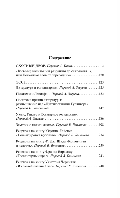 В книгу включена не только легендарная повесть-притча Оруэлла «‎Скотный двор»‎, но и эссе разных лет – «‎Литература и тоталитаризм»‎, «‎Писатели и Левиафан»‎, «‎Заметки о национализме»‎ и другие.