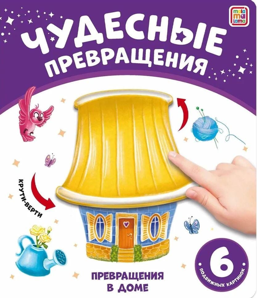 Серия «Чудесные превращения» от торговой марки Malamalama — это книги, полные волшебства. На каждом развороте — добрый стишок и вращающийся элемент, благодаря которому одна забавная и милая фигурка становится совершенно другой. Малыш сможет повернуть его пальчиком, не прилагая никаких усилий, и увидеть настоящее чудесное превращение. В книге «Превращения в доме» игрушки, сладости или зверюшки становятся предметами домашнего обихода.