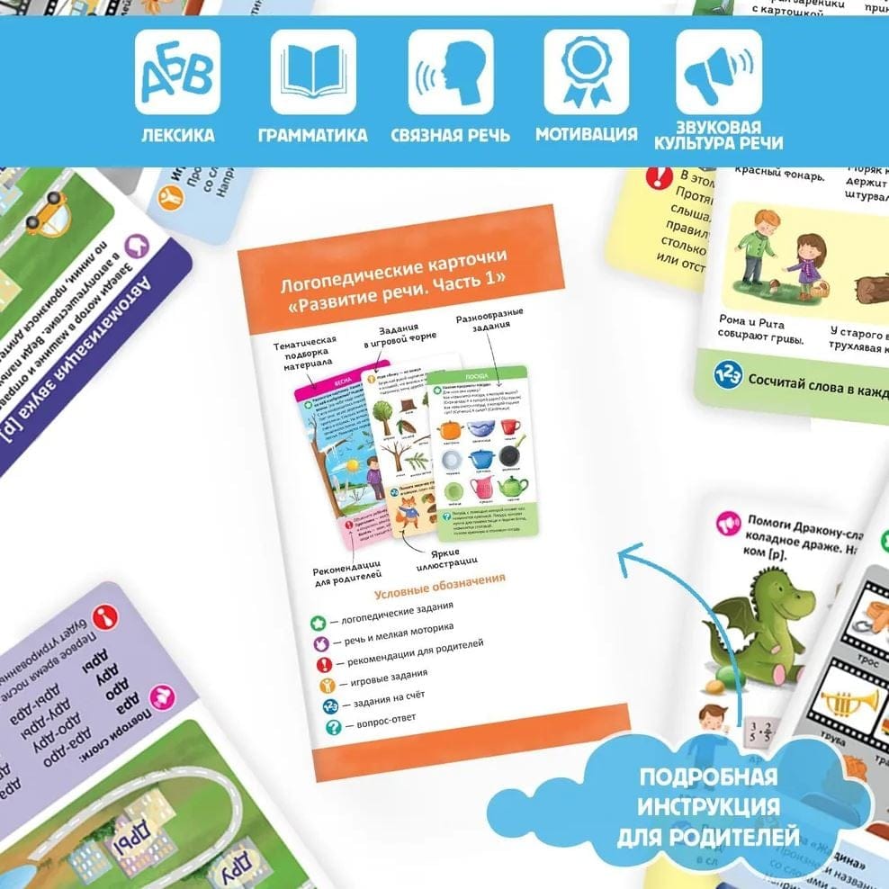 Это умные карточки, которые помогут вашему малышу стать настоящим вундеркиндом с пелёнок. Карточки разбиты на наборы по темам, которые направлены на постановку и автоматизацию звуков, предлагают различные упражнения для артикуляционной гимнастики, способствуют запуску речи. Это логопедическое пособие адресовано логопедам, дефектологам, родителям. Оно может также стать отличным подарком и малышу ваших друзей, и для группы в детском саду.