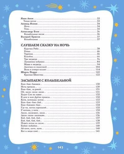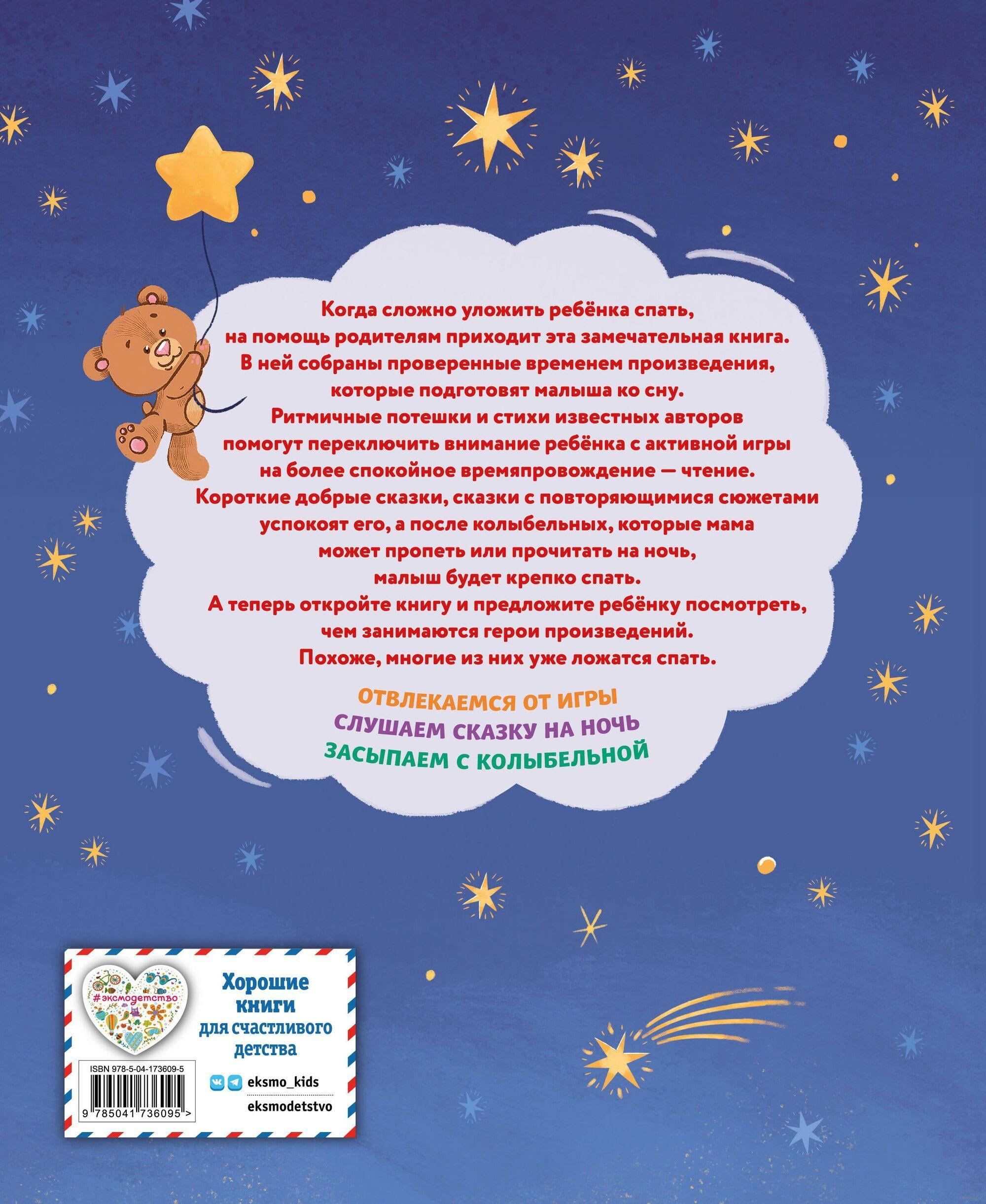 Уже стемнело, а малыш совсем не хочет спать. Предложите ему вместе с вами почитать эту замечательную книгу. Добрые потешки и стихотворения известных поэтов помогут ребёнку отвлечься от игры, любимые сказки — расслабиться и настроиться на сон, а колыбельные, которые мама может прочитать или пропеть ласковым голосом, укачают малыша.