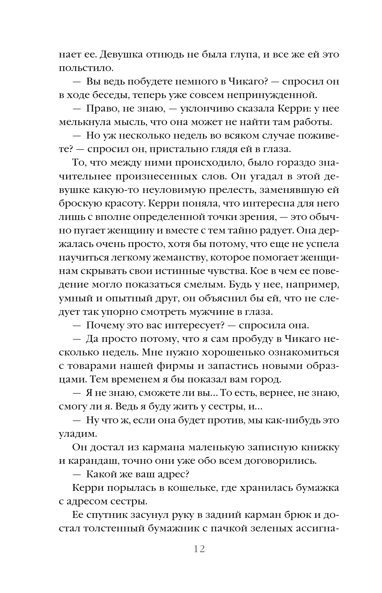 «Сестра Керри» — первый роман Теодора Драйзера, выпущенный на рубеже веков, в 1900 году. Для мировой литературы этот роман стал одним из символов американского реализма: с неподдельной правдоподобностью Драйзер рисует картину провинциальной актрисы, ищущей счастья в большом городе…