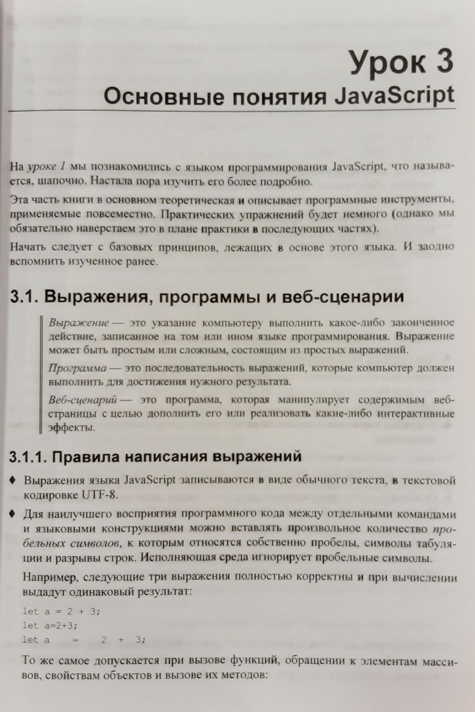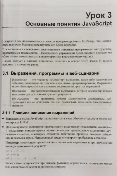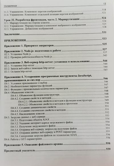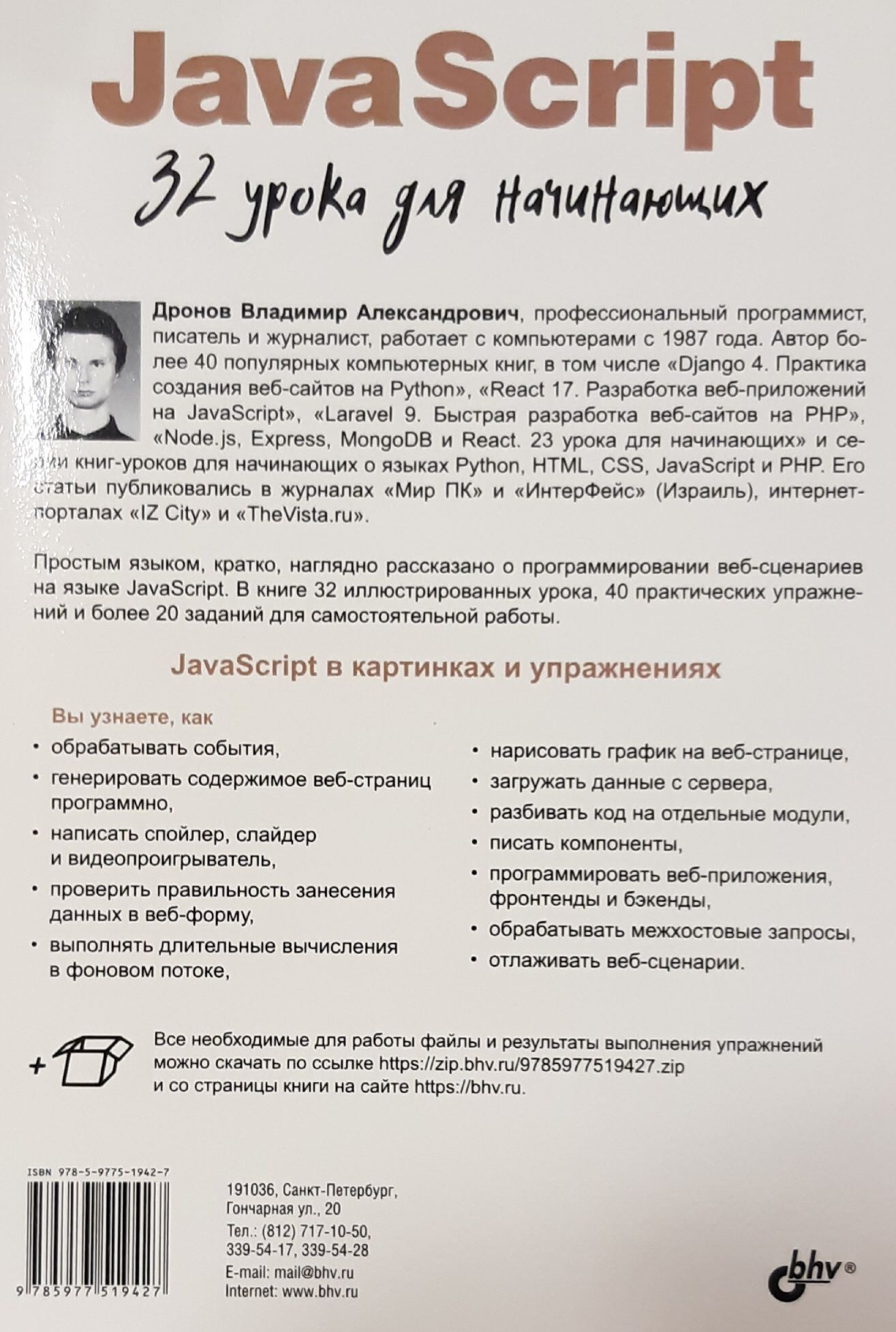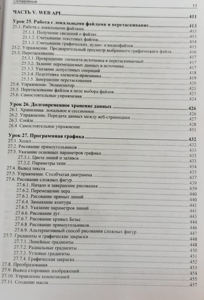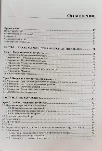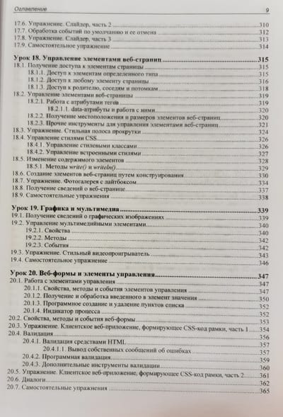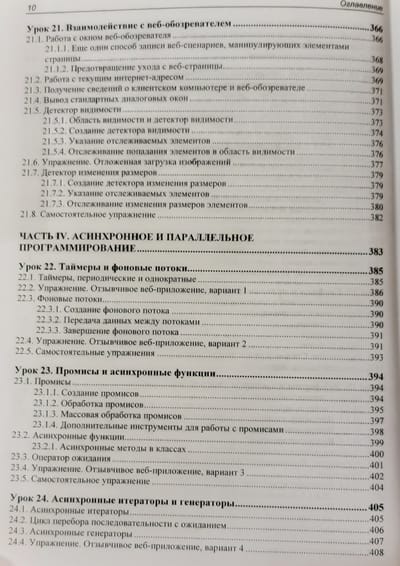 В книге 32 иллюстрированных урока, 40 практических упражнений на тему программирования веб-сценариев и более 20 заданий для самостоятельной работы. Изложены основы JavaScript: типы данных, переменные, управляющие конструкции, функции, массивы, объекты, классы, регулярные выражения, модули, средства для обработки исключений и отладки. Раскрыты события и их обработка, генерирование содержимого страниц, работа с графикой и мультимедиа, веб-формами и элементами управления, взаимодействие с веб-обозревателем, детекторы видимости и изменения размеров. Рассмотрены таймеры, фоновые потоки, использование промисов и асинхронных функций, работа с файлами, программная графика и загрузка данных с веб-сервера. Рассказано о программировании фронтенд- и бэкенд-приложений в среде Node.js, а также об обработке межхостовых запросов. Электронный архив на сайте издательства содержит коды всех примеров и результаты выполнения упражнений.