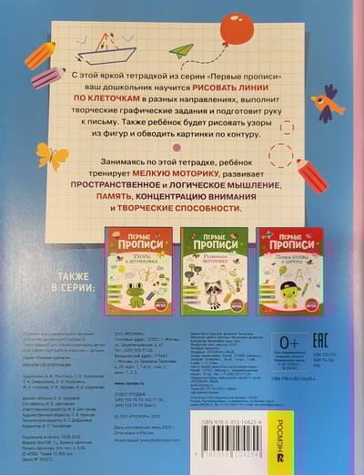 С этой яркой тетрадкой из серии «Первые прописи» ваш дошкольник научится рисовать линии по клеточкам в разных направлениях, выполнит творческие графические задания и подготовит руку к письму. Также ребёнок будет рисовать узоры из фигур и обводить картинки по контуру.
