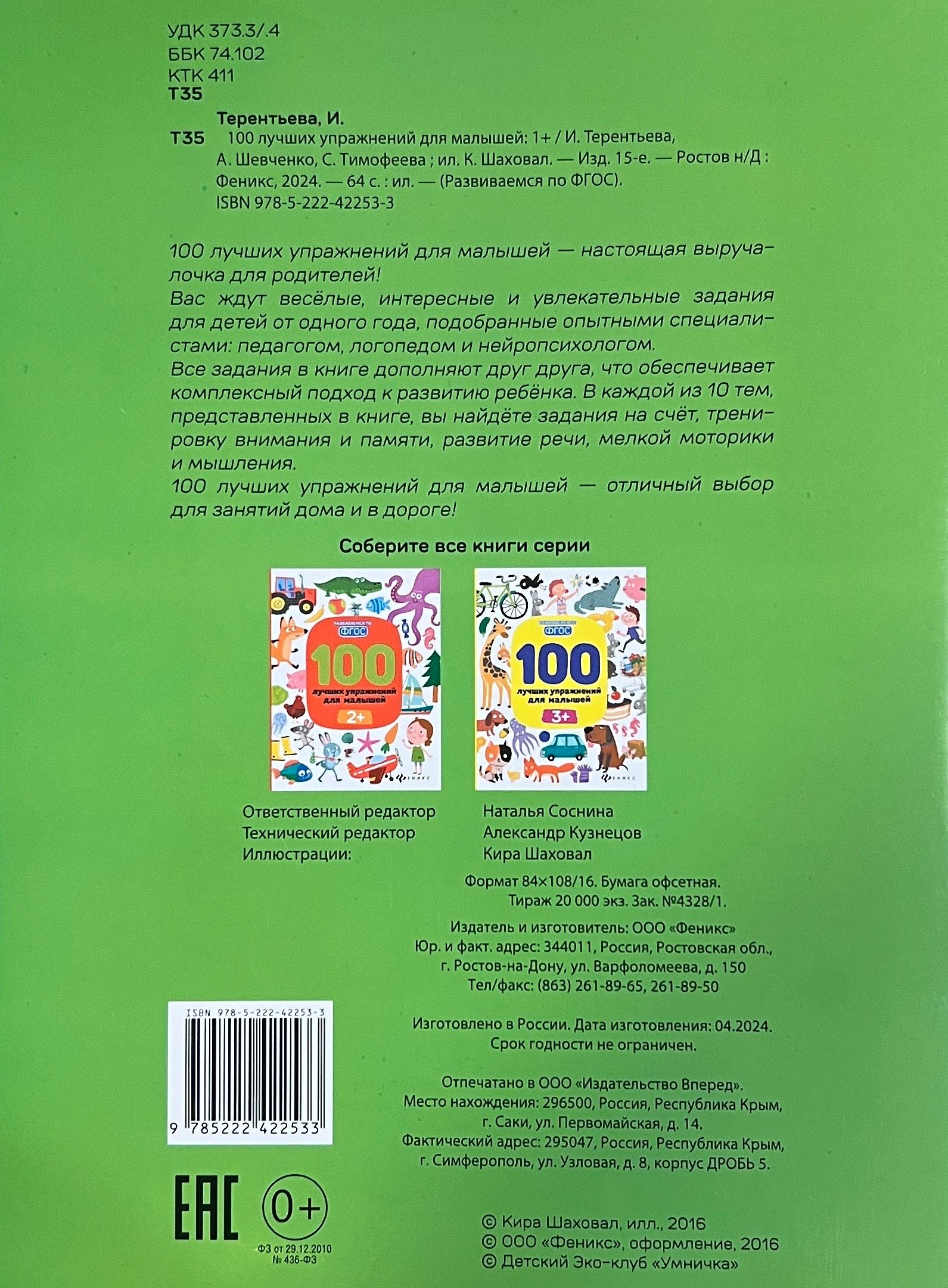 100 лучших упражнений для малышей - настоящая выручалочка для родителей. Вас ждут веселые, интересные и увлекательные задания для детей от одного года, подобранные опытными специалистами: педагогом, логопедом и нейропсихологом. Все задания в книге дополняют друг друга, что обеспечивает комплексный подход к развитию ребёнка. В каждой из 10 тем, представленных в книге, вы найдёте задания на счет, тренировку внимания и памяти, развитие речи, мелкой моторики и мышления. 100 лучших упражнений для малышей - отличный выбор для занятий дома и в дороге.