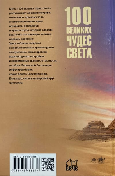 Книга «100 чудес света» рассказывает о великих архитектурных памятниках прошлых эпох, о самоотверженном труде историков, археологов и архитекторов, которые сделали все, чтобы эти шедевры не были преданы забвению.
