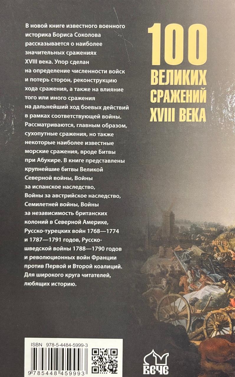 В новой книге известного военного историка Бориса Соколова рассказывается о наиболее значительных сражениях XVIII века. Упор сделан на определение численности войск и потерь сторон, реконструкцию хода сражения, а также на влияние того или иного сражения на дальнейший ход боевых действий в рамках соответствующей войны. Рассматриваются, главным образом, сухопутные сражения, но также некоторые наиболее известные морские сражения, вроде Битвы при Абукире. В книге представлены крупнейшие битвы Великой Северной войны, Войны за испанское наследство, Войны за австрийское наследство, Семилетней войны, Войны за независимость британских колоний в Северной Америке, Русско-турецких войн 1768—1774 и 1787—1791 годов, Русско-шведской войны 1788—1790 годов и революционных войн Франции против Первой и Второй коалиции. Для широкого круга читателей, любящих историю.