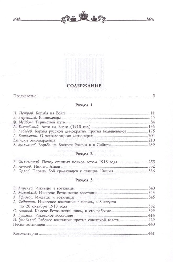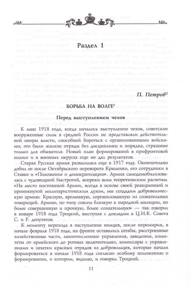 Боевые действия описываются на фоне политических акций Комуча, Уфимской Директории, Временного Сибирского правительства вплоть до вступления в верховное командование адмирала Колчака, то есть с мая по ноябрь 1918 г. Книга снабжена обширными и впервые публикуемыми комментариями, содержащими несколько сот неизвестных биографических справок об авторах и героях очерков.