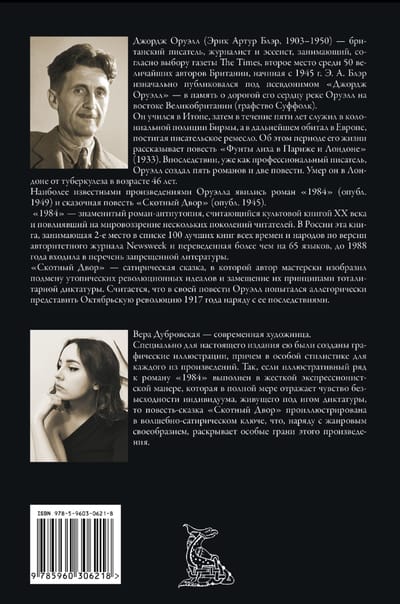 1984 - знаменитый роман-антиутопия, считающийся культовой книгой XX века и повлиявший на мировоззрение нескольких поколений читателей. В России эта книга, занимающая 2-е место в списке 100 лучших книг всех времен и народов по версии авторитетного журнала Newsweek и переведенная более чем на 65 языков. «Скотный Двор» - сатирическая сказка, в которой автор мастерски изобразил подмену утопических революционных идеалов и замещение их принципами тоталитарной диктатуры. Новый перевод был специально выполнен для настоящего издания Ростиславом Грищенковым. Иллюстрации Веры Дубровской.