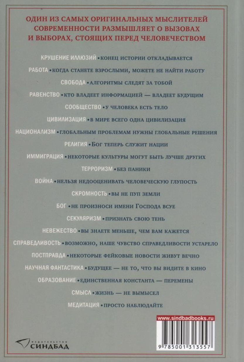 Что происходит в современном мире и каков глубинный смысл этих событий? Почему либеральная демократия переживает кризис? Как быть с эпидемией фейковых новостей? Как не стать рабами компьютерных алгоритмов? Удастся ли предотвратить экологический коллапс? Действительно ли происходит возврат к религии? Как бороться с терроризмом? Будет ли новая мировая война?