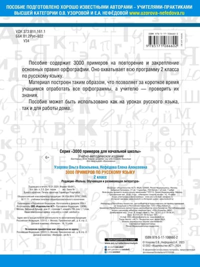 Пособие содержит 3000 примеров на повторение и закрепление основных правил орфографии. Оно охватывает всю программу 2 класса по русскому языку. Материал построен таким образом, что позволяет за короткое время учащимся отработать все орфограммы, а учителю проверить их знания. Пособие может быть использовано как на уроках русского языка, так и для работы дома.