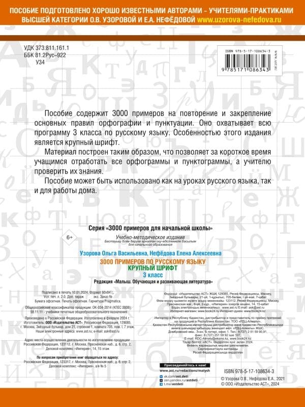 Пособие содержит 3000 новых примеров на повторение и закрепление основных правил орфографии и пунктуации. Оно охватывает всю программу 3 класса по русскому языку. Особенностью этого издания является крупный шрифт. Материал построен таким образом, что позволяет за короткое время учащимся отработать все орфограммы и пунктограммы, а учителю проверить их знания. Пособие может быть использовано как на уроках русского языка, так и для работы дома.
