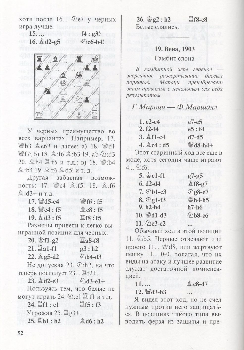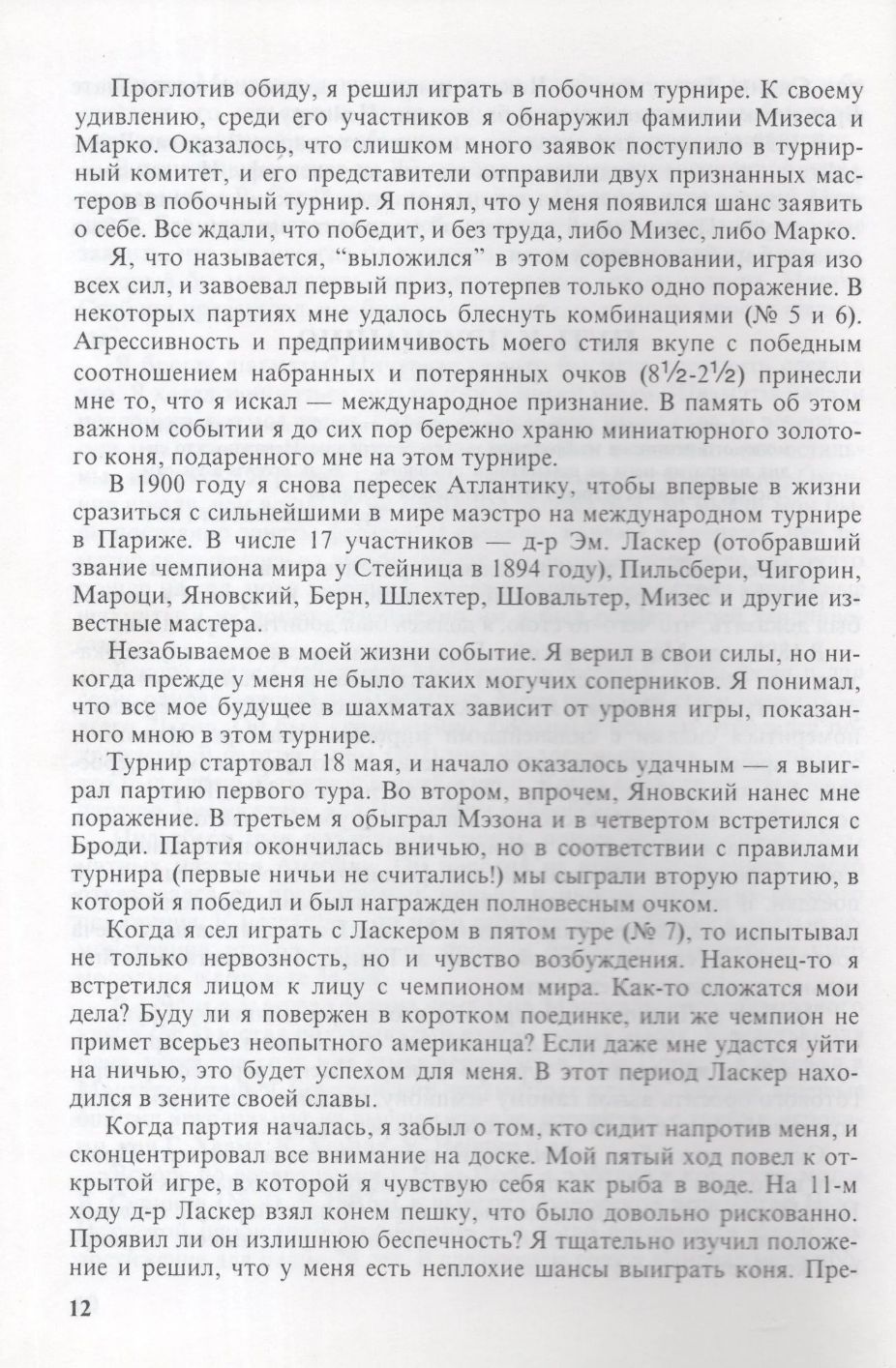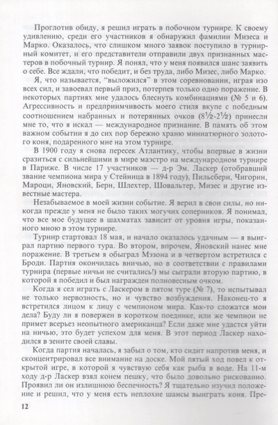 Имя Фрэнка Джеймса Маршалла - одно из самых славных в истории шахмат, а его книга о себе, перевод которой с английского предлагается читателю, одна из, как сказали бы сегодня, "культовых" в шахматной литературе. Даже странно, что это - первое ее издание на русском языке. Надо ли представлять Ф. Маршалла? Упомянем лишь несколько фактов: на протяжении почти 30 лет он удерживал звание чемпиона США, дважды играл матчи на звание чемпиона мира, на его счету победы над Капабланкой и Ласкером, контратака в испанской партии, носящая его имя, и поныне входит в дебютный репертуар сильнейших гроссмейстеров мира. Его яркий стиль, личное обаяние, безграничная преданность шахматам снискали ему любовь поклонников игры во всем мире. В его активе много ярких турнирных побед, но одна - в Кембридж-Спрингсе - стоит особняком. Блестящий состав участников (во главе с чемпионом мира Ласкером) и досрочная победа без поражений с огромным отрывом от преследователей - одна из ярчайших страниц шахматной истории. Во всех отраслях человеческой деятельности есть свои славные имена. В шахматах одно из таких имен - Фрэнк Маршалл. Книга, которую держит в руках читатель, состоит из двух частей - в первой Маршалл рассказывает о своей жизни в шахматах, а вторая - 140 лучших партий Ф. Маршалла, отобранных им самим. Можно с уверенностью сказать, что разбор живых и остроумных партий (скучных в сборнике нет!) доставит читателю истинное удовольствие.