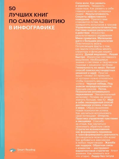 Каждая инфографика в этой книге — работающий инструмент. Внутри — практики, выводы и стратегии из 50 бестселлеров: от привычек и эмоций до целей и лидерства — все, что нужно, чтобы настроить внутреннюю систему и перестать буксовать на месте. Книга поможет выстроить личную стратегию и выбрать вектор, который ведет к настоящим изменениям. Подойдет всем, кто устал метаться, хочет больше ясности и ищет рабочие решения.