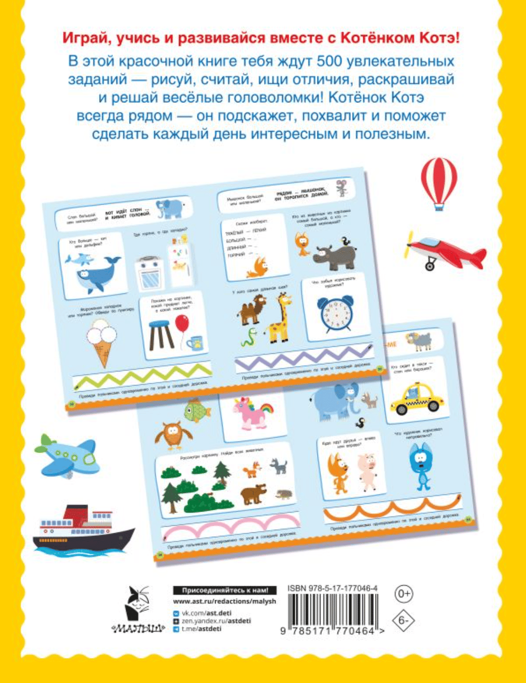 «500 заданий для малышей с Котёнком Котэ» — это сборник увлекательных головоломок, лабиринтов, обводок и штриховок, игр с буквами и словами, задачек на логику и сообразительность. Вместе с любимым героем популярного анимационного проекта — любознательным и весёлым Котёнком Котэ — малыши разовьют речь, мышление, внимание, память, воображение и мелкую моторику. У книги качественная бумага, яркие цветные иллюстрации, большой удобный формат — много увлекательных заданий на каждой странице.