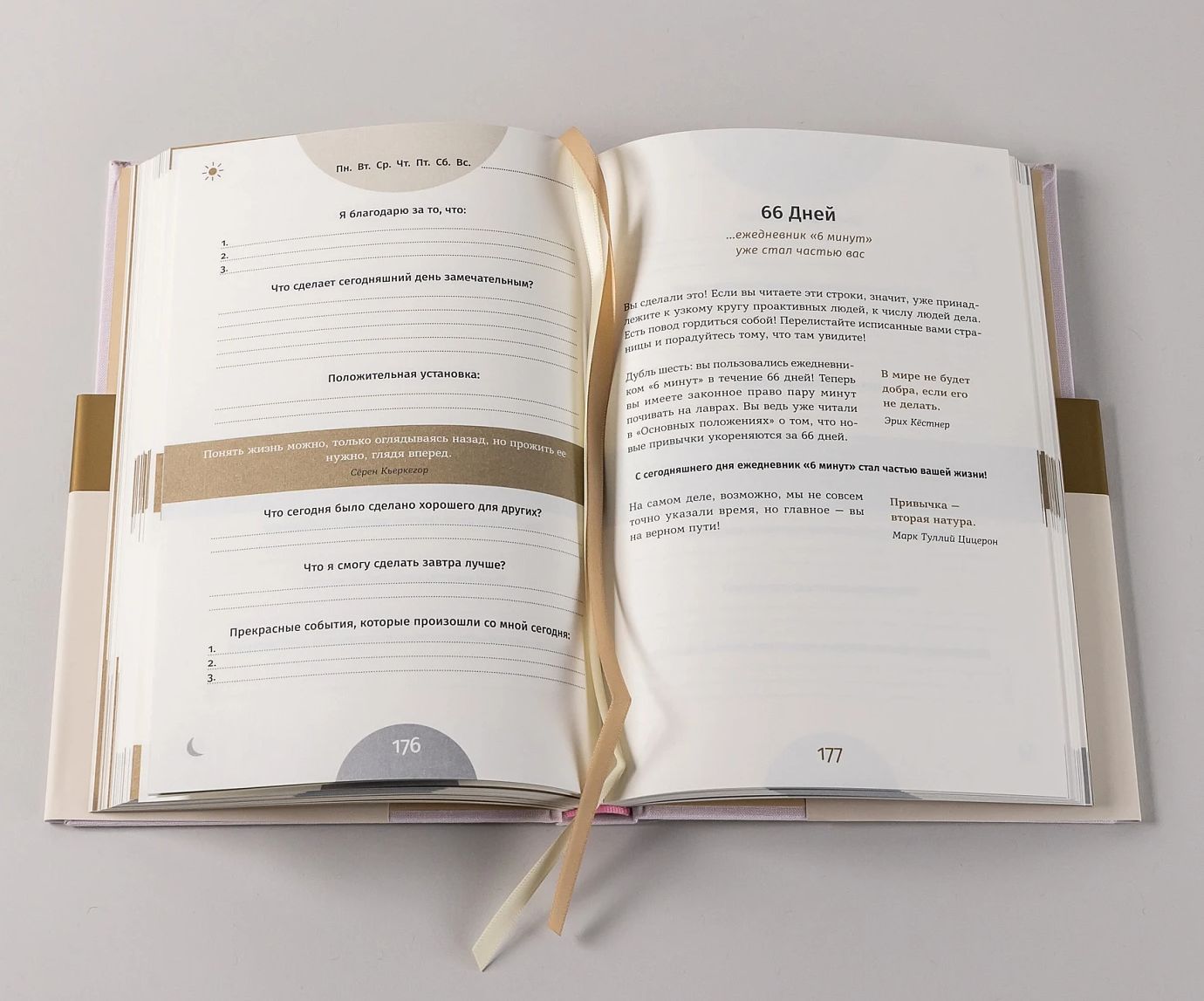 Самый продаваемый мотивационный ежедневник в Германии. Бестселлер Amazon. Переведен на 15 языков. Каждый день благодаря ему более 300 000 человек по всему миру делают свою жизнь осознаннее. Счастье не является результатом везения или случайного стечения обстоятельств. Стать счастливым помогают правильные установки и образ мыслей. 3 минуты утром и 3 минуты вечером — столько времени займет выработка полезных привычек, которые сделают вашу жизнь осознаннее, гармоничнее, а значит - счастливее. Проверенные на практике принципы позитивной психологии и нейробиологии помогут вам достичь целей, пережить трудные моменты, улучшить отношения с другими людьми и идти по жизни уверенно. С ежедневником вы сможете улучшать свою жизнь постоянно и проактивно, шаг за шагом и каждый день!