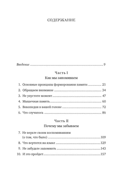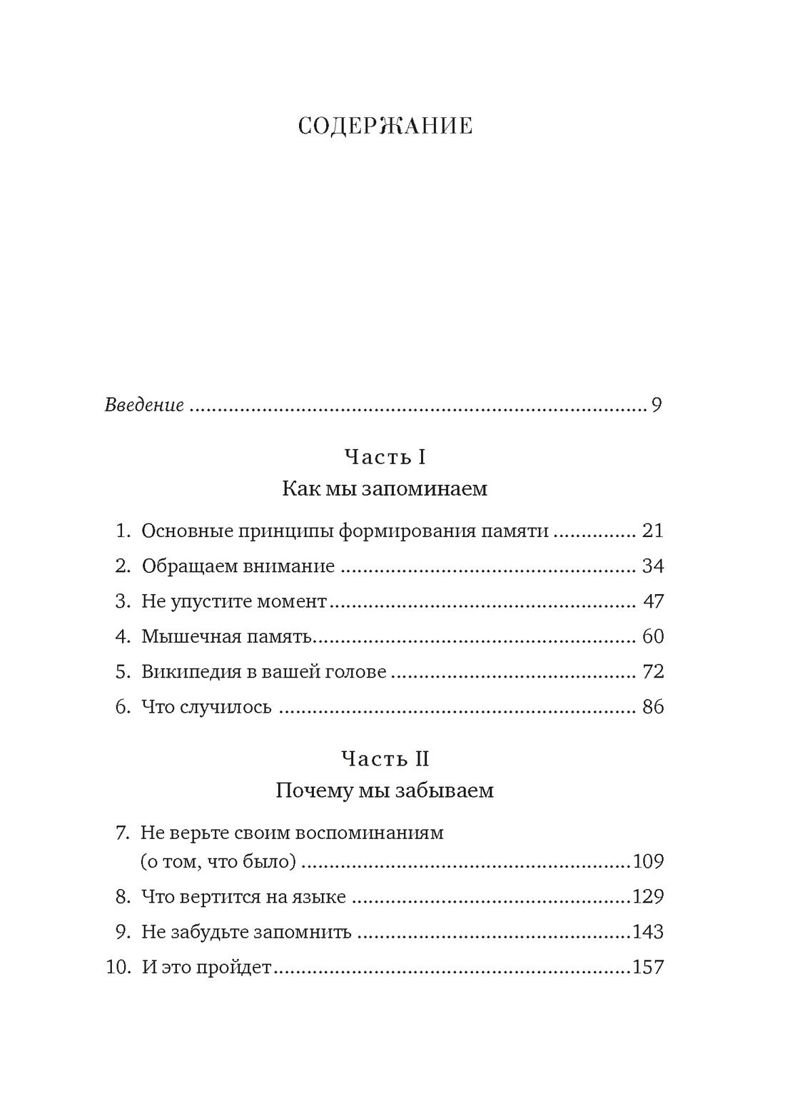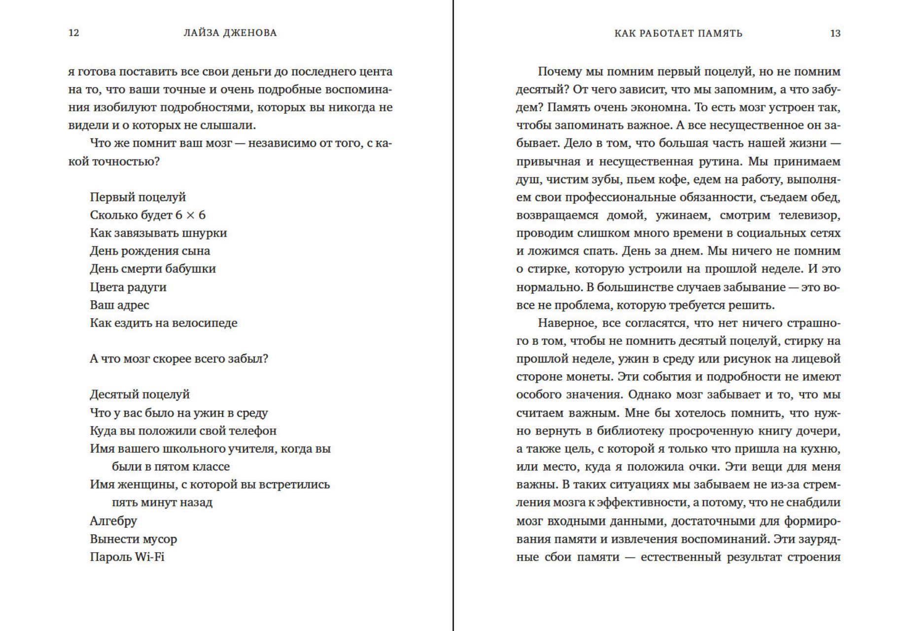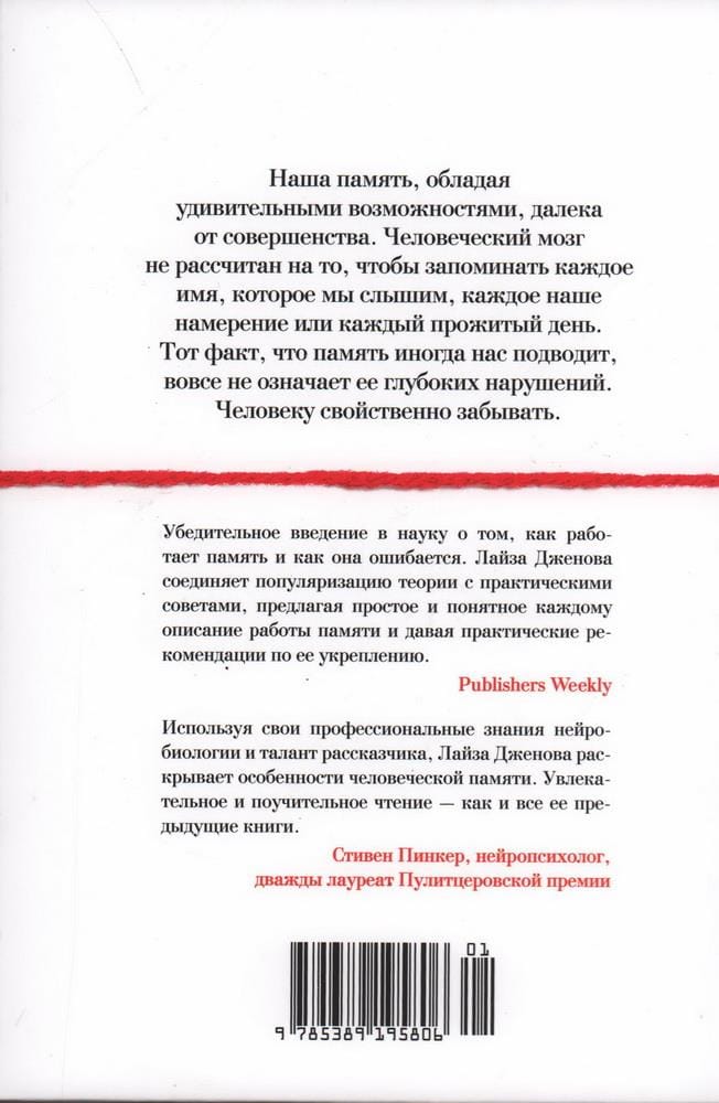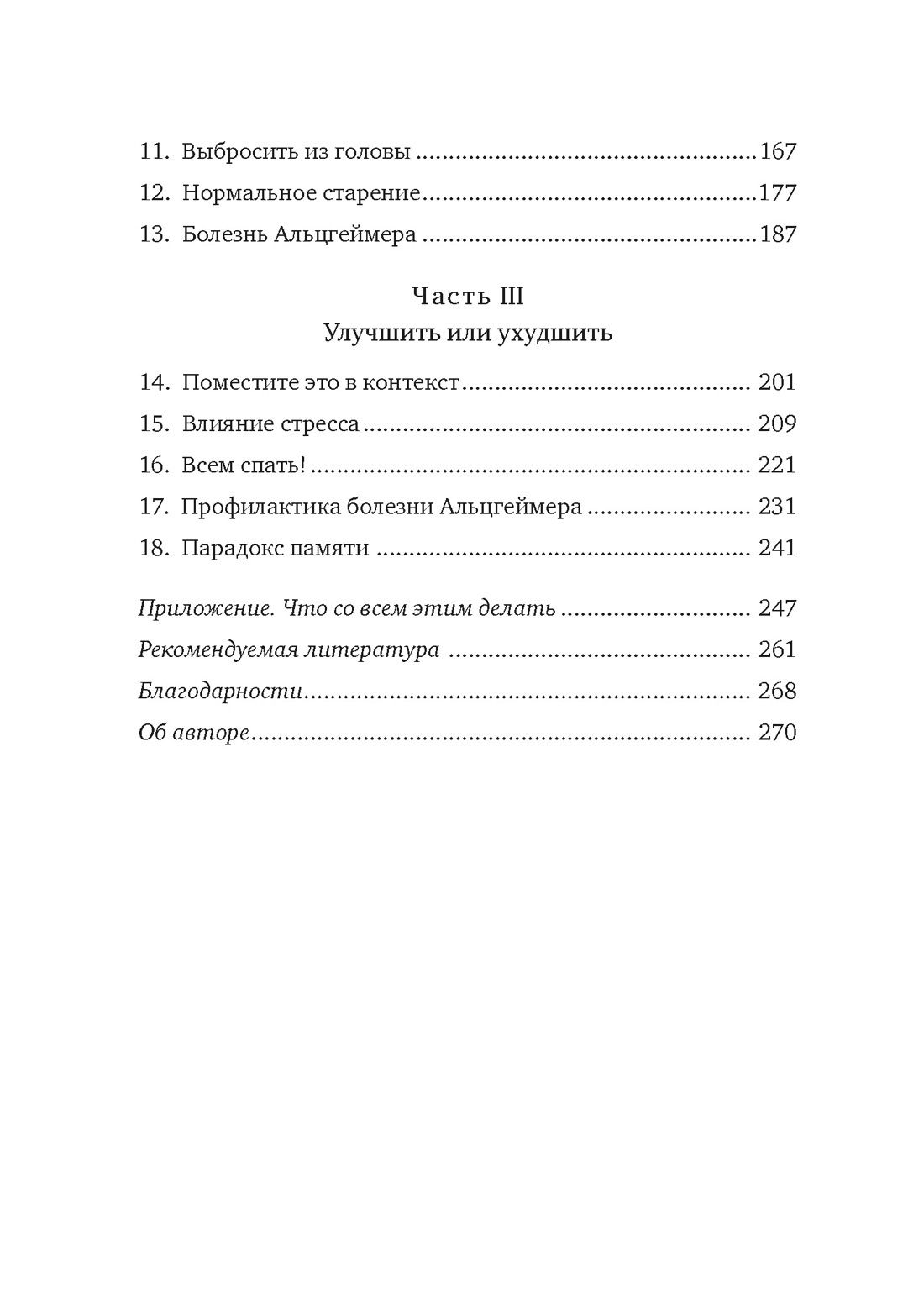 Вы поймете разницу между нормальной забывчивостью и забывчивостью, вызванной болезнью Альцгеймера, узнаете, как сильно влияют на память смысл, эмоции, сон и контекст. Понимая принципы работы памяти, ее естественные недостатки и потенциальную суперсилу, вы сможете значительно усилить свою способность запоминать, а также меньше волноваться, когда вы что-то забудете. «Каковы наши реальные взаимоотношения с памятью? Как нам относиться к ней? Попробуйте осмыслить глубину парадокса: память — это все и ничто. Ее следует воспринимать серьезно, но относиться к ней легко. Мы можем сформировать обоснованные ожидания и улучшить взаимоотношения со своей памятью. Нам больше не нужно ее бояться. И это может изменить нашу жизнь». (Лайза Дженова)
