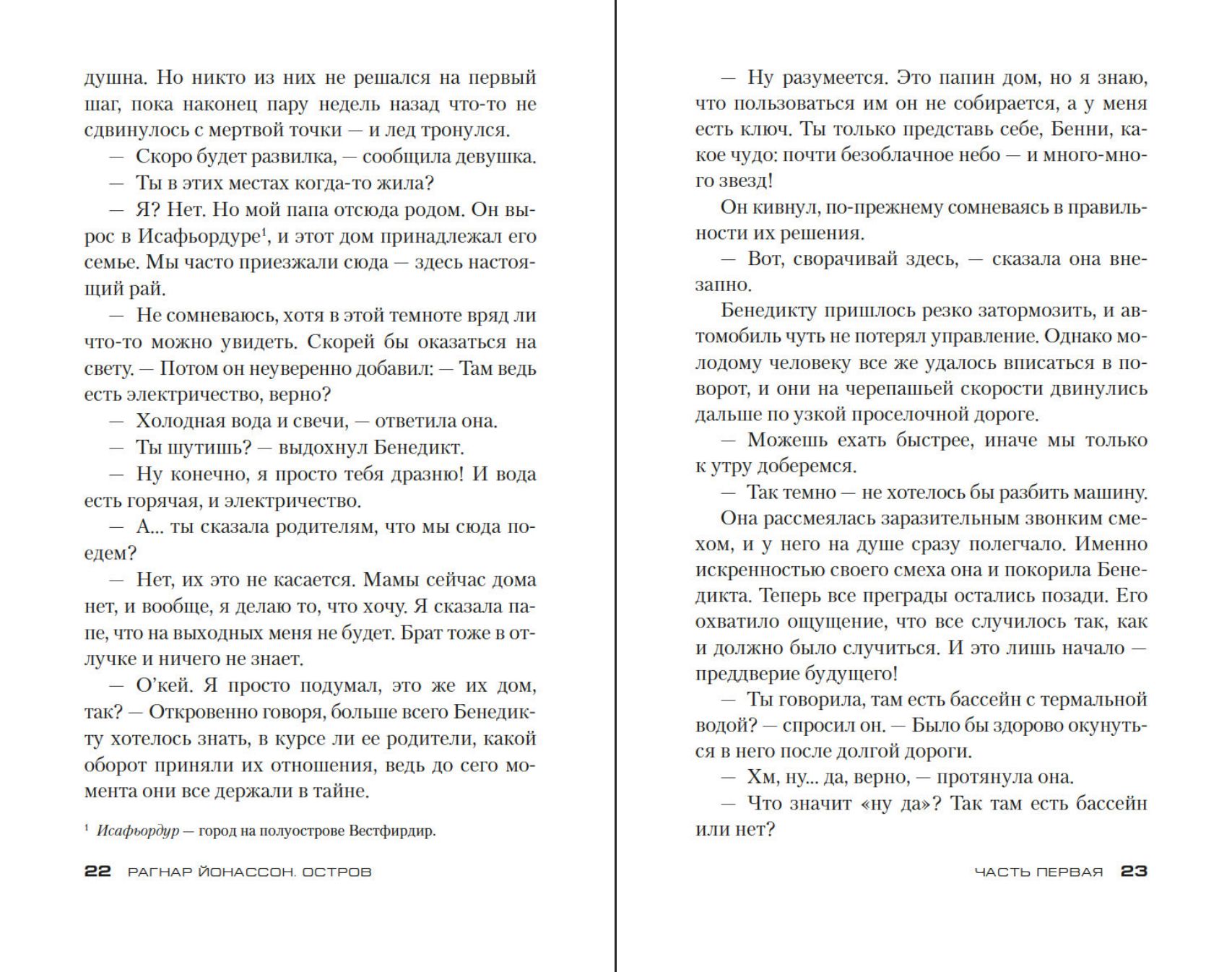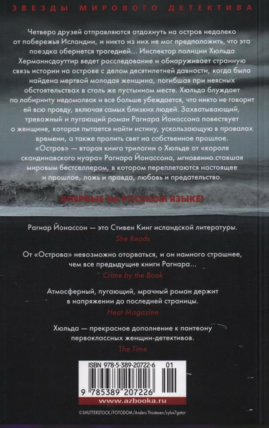 Четверо друзей отправились отдохнуть на остров недалеко от побережья Исландии, и никто из них не мог предположить, что эта поездка обернется трагедией... Инспектор полиции Хюльда Херманнсдоуттир ведет расследование и обнаруживает странную связь истории на острове с делом десятилетней давности, когда была найдена мертвой молодая женщина, погибшая при неясных обстоятельствах в столь же пустынном месте. Хюльда блуждает по лабиринту недомолвок и все больше убеждается, что никто не говорит ей всю правду, включая самых близких людей. Захватывающий, тревожный и пугающий роман Рагнара Йонассона повествует о женщине, которая пытается найти истину, ускользающую в провалах времени, а также пролить свет на собственное прошлое. «Остров» — вторая книга в трилогии о Хюльде от «короля скандинавского нуара» Рагнара Йонассона, мгновенно ставшая мировым бестселлером, в котором переплетаются настоящее и прошлое, ложь и правда, любовь и предательство.