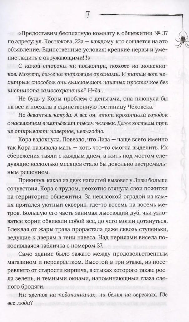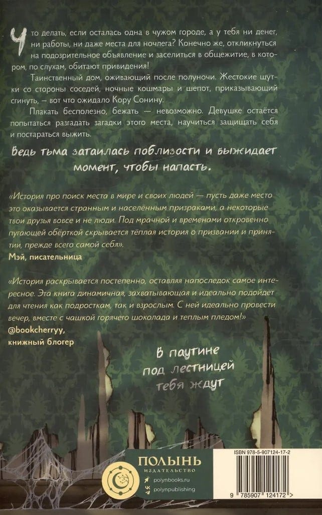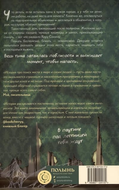 Что делать, если осталась одна в чужом городе, а у тебя ни денег, ни работы, ни даже места для ночлега?Конечно же, откликнуться на подозрительное объявление и заселиться в общежитие, в котором, по слухам, обитают привидения. Таинственный дом, оживающий после полуночи. Жестокие шутки со стороны соседей, ночные кошмары и шепот, приказывающий сгинуть, - вот что ожидало Кору Сонину. Плакать бесполезно, бежать - невозможно. Девушке остаётся попытаться разгадать загадки этого места, научиться защищать себя и постараться выжить. Ведь тьма затаилась поблизости и выжидает момент, чтобы напасть.