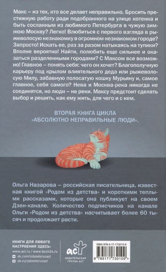 Макс – из тех, кто все делает неправильно. Бросить престижную работу ради подобранного на улице котенка и быть сосланным из любимого Петербурга в чужую зимнюю Москву? Легко! Влюбиться с первого взгляда в рыжеволосую незнакомку в огромном незнакомом городе? Запросто! Искать ее, раз за разом натыкаясь на тупики? Вполне вероятно! Найти, полюбить еще сильнее и оказаться разделенными городами? С Максом все возможно! Главное – понять себя: чего он хочет? Благополучную карьеру под крылом влиятельного деда или рыжеволосую Милу, забавную полосатую кошку Мурьяну и, самое главное, себя самого? Нева и Москва-река никогда не соединятся, но люди – не реки. Максу предстоит сделать выбор и решить, как ему жить, для чего и с кем.