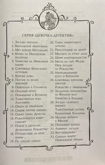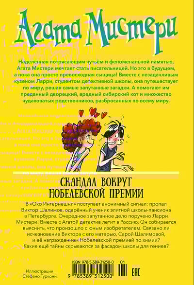Наделённая потрясающим чутьём и феноменальной памятью, Агата Мистери мечтает стать писательницей. Но это в будущем, а пока она просто превосходная сыщица! Вместе с незадачливым кузеном Ларри, студентом детективной школы, она путешествует по миру, решая самые запутанные загадки. А помогают им преданный дворецкий, вредный сибирский кот и множество чудаковатых родственников.