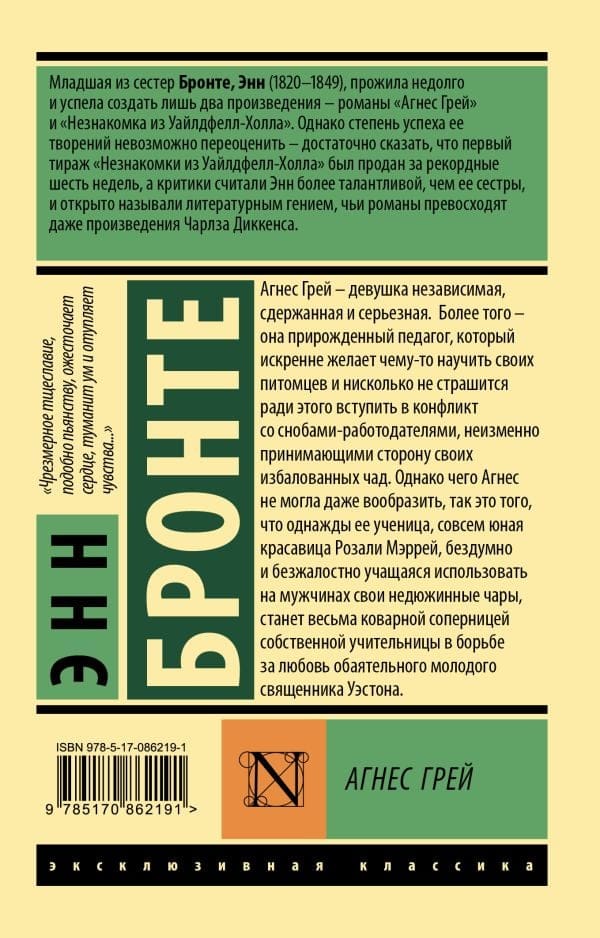 Агнес Грей – девушка независимая, сдержанная и серьезная. Более того – она прирожденный педагог, который искренне желает чему-то научить своих питомцев и нисколько не страшится ради этого вступить в конфликт со снобами-работодателями, неизменно принимающими сторону своих избалованных чад. Однако чего Агнес не могла даже вообразить, так это того, что однажды ее ученица, совсем юная красавица Розали Мэррей, бездумно и безжалостно учащаяся использовать на мужчинах свои недюжинные чары, станет весьма коварной соперницей собственной учительницы в борьбе за любовь обаятельного молодого священника Уэстона.